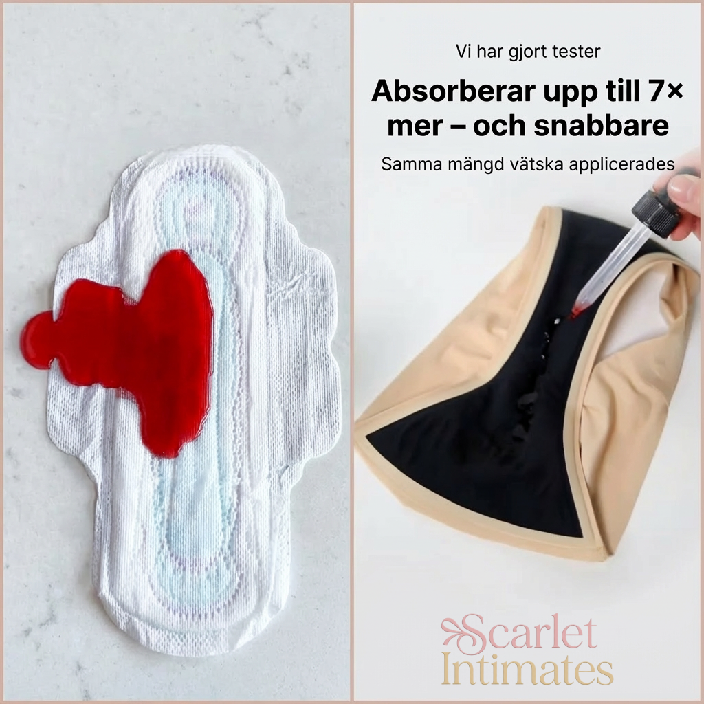 Scarlet Flow är trosan som bryter oron. Den ser ut och känns som vanliga underkläder, men inuti finns fyra smarta lager som absorberar mens och urin direkt och låser in vätskan så att ytan mot huden förblir torr. Resultatet: mindre oro, mer frihet och en vardag där du slipper planera livet runt “tänk om”.
